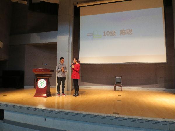接下来的是学生代表接受采访环节,本环节的主持人华之逸同学分别对13级张文静,12级张奕,11级许俐和10级陈聪进行了采访,几位同学就大学的学习、生活、工作以及规划等给在场的同学们提出了一些实践性的建议,其中许俐同学的一句“把专业课当自己的男女朋友”逗笑在场老师和同学,幽默而富有哲理的话道出了专业课的重要性与对待他们的态度。