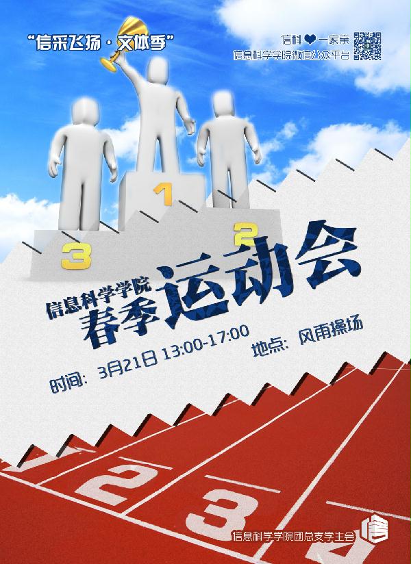 亲爱的同学们,春天是万物复苏的时节,趁着三月和煦的阳光与清新的空气,伴着春暖花开,我们是不是也应该走出来沉闷的寝室,到室外伸展一下身躯,强健一下体魄呢?“跃动青春,信志昂扬”信科院春季田径运动会在本周五即将举行,现在为大家准备了比赛的要求及注意事项,希望大家可以提前熟悉比赛规则,成为赛场上那一道靓丽的风景线!