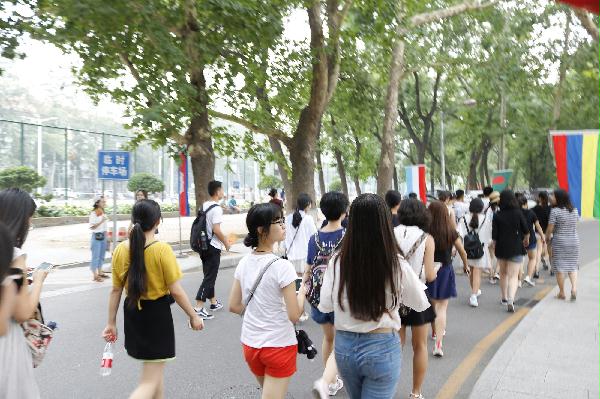 15:30,新生们开始了他们和北语的第一次亲密接触——游园会。在学长学姐的带领下,游园队伍从主楼出发,在万国墙合影,留下第一处北语印记。游园队伍沿途经过气势宏大的校东门、信科“主场”主南楼、万国旗飘扬的梧桐大道、汇集各地美食的清晏楼以及运动无阻的风雨操场。一路上,学长学姐们细心地为大家介绍了学校地点,耐心地讲解了大学生活需要注意的种种细节。新同学们在聆听讲解的同时也和学长学姐们进行了良好的互动。