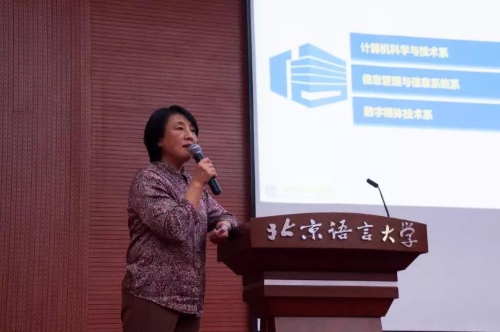 活动开始,杨尔弘教授概述了整个计算机体系,阐述了专业与学科这两个概念及两者的区别与联系,同时提出了计算机学科所要求的诸多素质。紧接着她介绍了信息科学学院学科特色,启发同学们思考“计算机+”模式,提出计算机可与其他学科,如经济学、语言学等结合。随后,她又通过汉诺塔和文本对比的例子,不仅告诉了大家什么是语言计算思维,还启发大家将一个实际问题转换成计算机问题后进行求解。