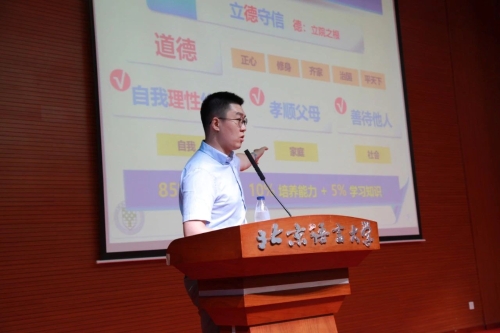 随后,信息科学学院党支部副书记李超做了主题发言。首先,李超老师代表院长、书记和学院全体师生,对来到北京语言大学信息科学学院的新生和家长表示热烈的欢迎。然后,他从信科院育人理念、学院特色、大类招生和培养、新生问题和十点忠告、学工队伍介绍五个方面入手进行了详尽的说明。