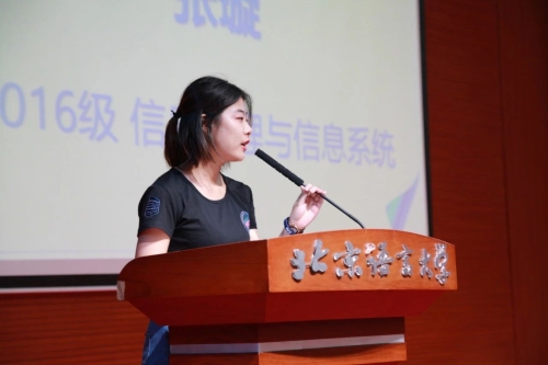 首先,来自2016级信息管理与信息系统1班的学生代表张璇发言。在发言中,她回顾了自己两年的北语时光:辅导员老师的关怀和帮助,让她变得独立自主;任课老师的指导和督促,让她严于律己,取得优异成绩;北语自由包容的环境让她生活充实,得到全面发展。在北语信科院,她不断成长进步,她表示,每位同学应在大学阶段打磨自己,努力拼搏,不忘初心,一定能成为有用的人才。