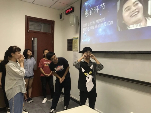 活动还设置了奖惩环节。获得胜利的小组得到了具有北语特色的明信片、文件夹,而被淘汰的小组则要接受各式各样的惩罚。几轮游戏结束后,班会接近了尾声。