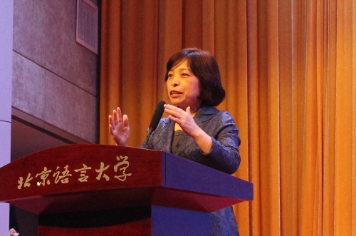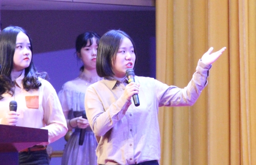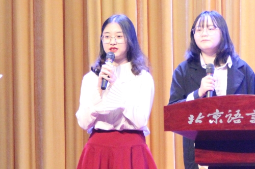 随后典礼拉开序幕,首先是人工智能类参赛成果展示及颁奖。获得中国大学生计算机设计大赛国家级一等奖的王静懿、刘冬滢展示了“基于神经网络辅助对外汉语声调教学研究”项目的完成过程。从数据准备到方案设计与接口制作,她们踏踏实实地走好每一步,展示了信科学子的风采。指导老师解焱陆表明,作品的优点是突出了北语特色的对外汉语教学,并与人工智能结合,具有创新性和实用性。同时,老师对15-18年中国大学生计算机设计大赛获奖数据进行了统计,对大家在这个赛事上的成绩做出了肯定。紧接着,黄益方副校长为人工智能类作品颁奖。