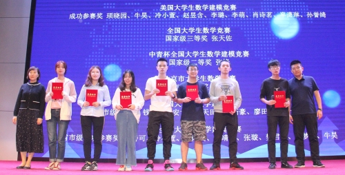 紧接着是数学类参赛成果展示及颁奖。获得美国大学生数学建模竞赛H奖的樊恒岩代表小组展示了建模成果。冯艳宾老师对作品进行了点评,他认为,作品的优点是跨领域研究、难度大、数形结合、程序计算出模型结果等。同时强调本类作品获奖所需素养和要求是团队协作与分工、信息检索能力、分析问题与解决问题的能力。紧接着,学生处副处长张洋老师,信息科学学院邵艳秋老师为数学类作品颁奖。