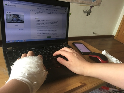 在唐老师等全体信科老师的共同努力下,虽然面对疫情,但学院各项工作都在有条不紊的开展着。不为人所知的是,唐老师在这段时间一直都是带伤坚持工作。大年三十,唐老师的左手不慎受伤(手掌被利器戳穿),一直缠着厚厚的纱布,工作、生活只能用右手。唐老师在谈及此事时说:“相比许多抗‘疫’前线的人员,这不算什么,作为北语信科的一名教师,尽全力做好本质工作,做好师生的教务服务和管理工作,也是为抗‘疫’做贡献了。”