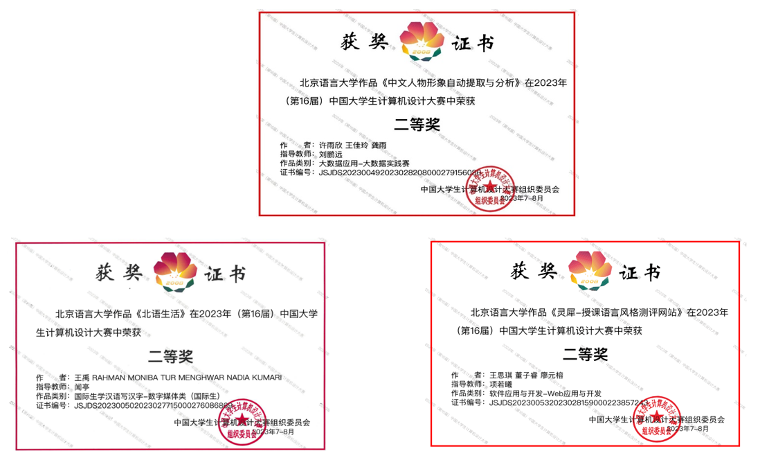 2023年(第16届)中国大学生计算机设计大赛已经落下帷幕。北语学子表现优异,共有15件作品在全国总决赛中获得奖项,其中许雨欣等同学的“中文人物形象自动提取与分析”等8件作品荣获二等奖,陈欣予等同学的“宝贝鱼的中文故事”等7件作品荣获三等奖。
